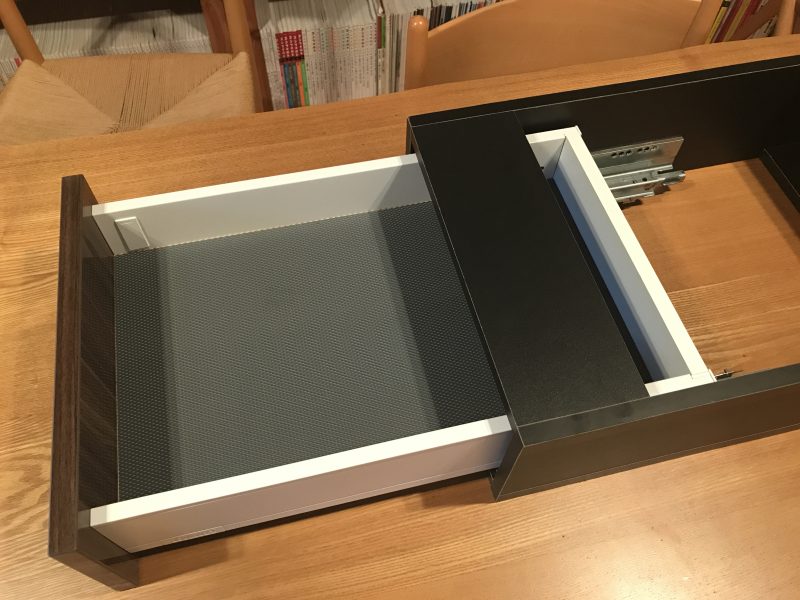 引き出しには引き手金物を付けるか、プッシュオープンにするか、場所によって使い分けていますが、