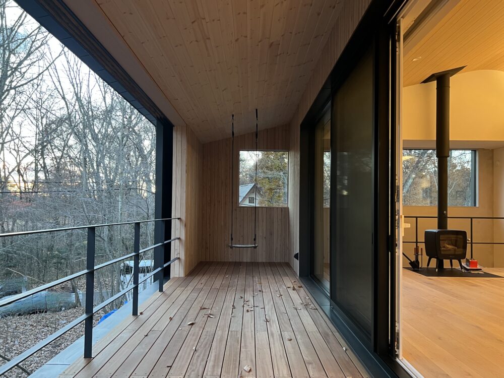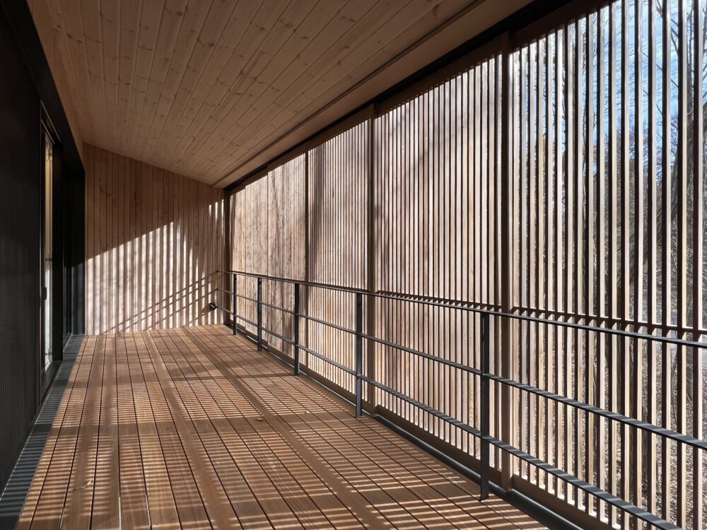 2階と1階の南面全域に格子戸を設けるとで、外部軒下空間が「外になったり内になったり」することができて、夏と冬、昼と夜、滞在時と留守の時、場面ごとに建築の表情が変わります。