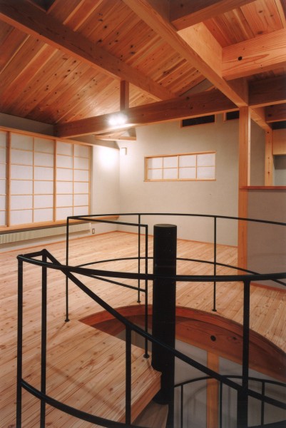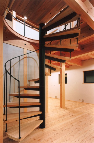 家の中心に螺旋階段を置き、2階の床は丸く切り取られている。その廻りには居間、食堂、台所、畳コーナー、ワークスペース。2階に上がった瞬間、目の前には大きなガラス越しに大自然が現われる。春の新緑、風が涼しい夏の夜、秋の紅葉、極寒の雪景色、季節の移ろいを感じながら2階には人が集い、いつも賑やかな場所であってほしい。