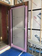 通り土間の木製ドアが設置されました。高性能な木製サッシです。