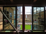 ただ今進行中 外壁の下地工事 岡谷市「小さなコートハウス」 外壁左官塗りの下地となる木工事が進行中です。 写真は、2階リビングから中庭方向を見たところです。中庭が、コの字型に囲まれている様子がわかります。 2014/08/02 ただ今進行中